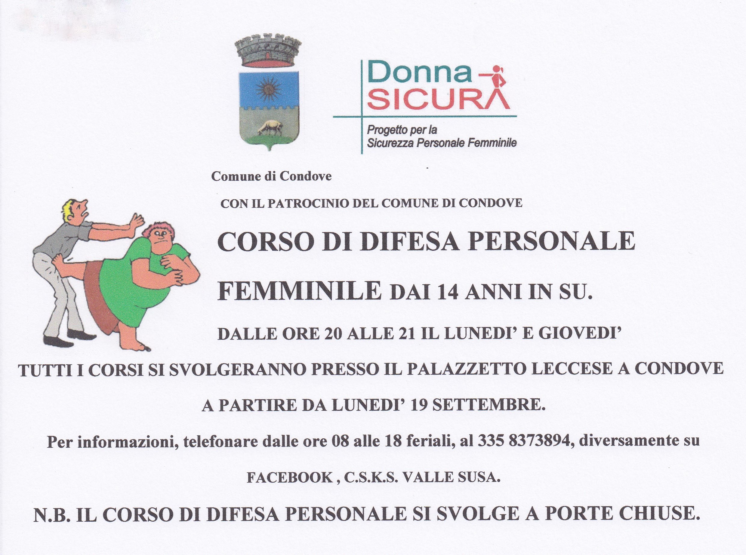 Il Comune di Condove ha patrocinato un corso di difesa personale per donne dai 14 anni in su. Il corso è gratuito (ad eccezione dell'assicurazione) ed è svolto da insegnanti del C.S.K.S. Valle Susa.