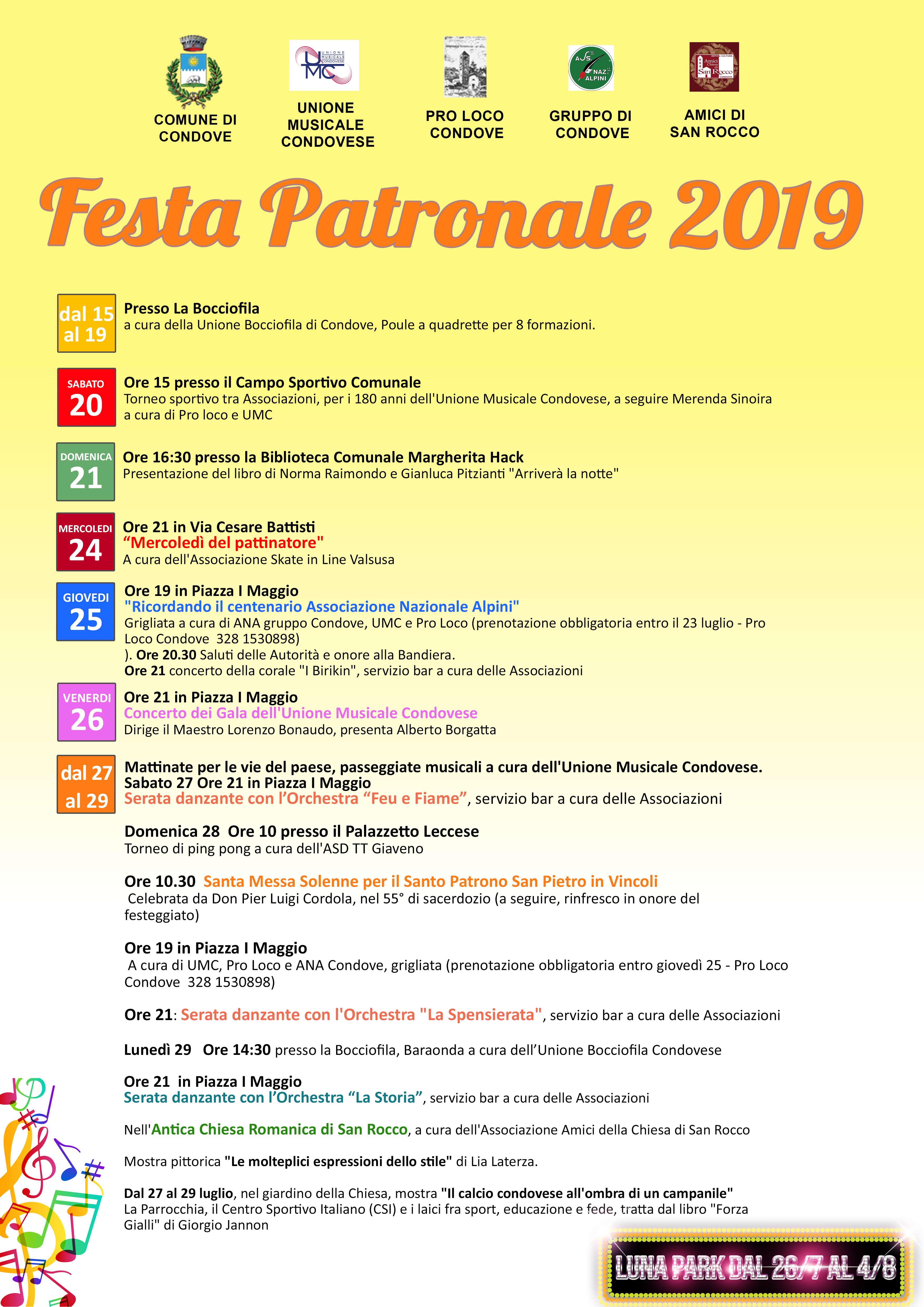 Il programma della Festa comincia già a partire da questo finesettimana: sabato 20 luglio, a partire dalle ore 15, presso il centralissimo campo sportivo comunale, l'Unione Musicale condovese, che quest'anno festeggia alla grande, spegnendo 180 candeline, organizza un torneo sportivo tra le associazioni condovesi che si sfideranno a calcetto, pallavolo e bocce. A seguire, Merenda Sinoira a cura di Pro loco e UMC. Domenica 21 luglio, alle ore 16.30, presso la biblioteca "Margherita Hack", la condovese Norma Raimondo presenterà, insieme a Gianluca Pitzianti, il romanzo "Arriverà la notte", edito da Il Graffio.