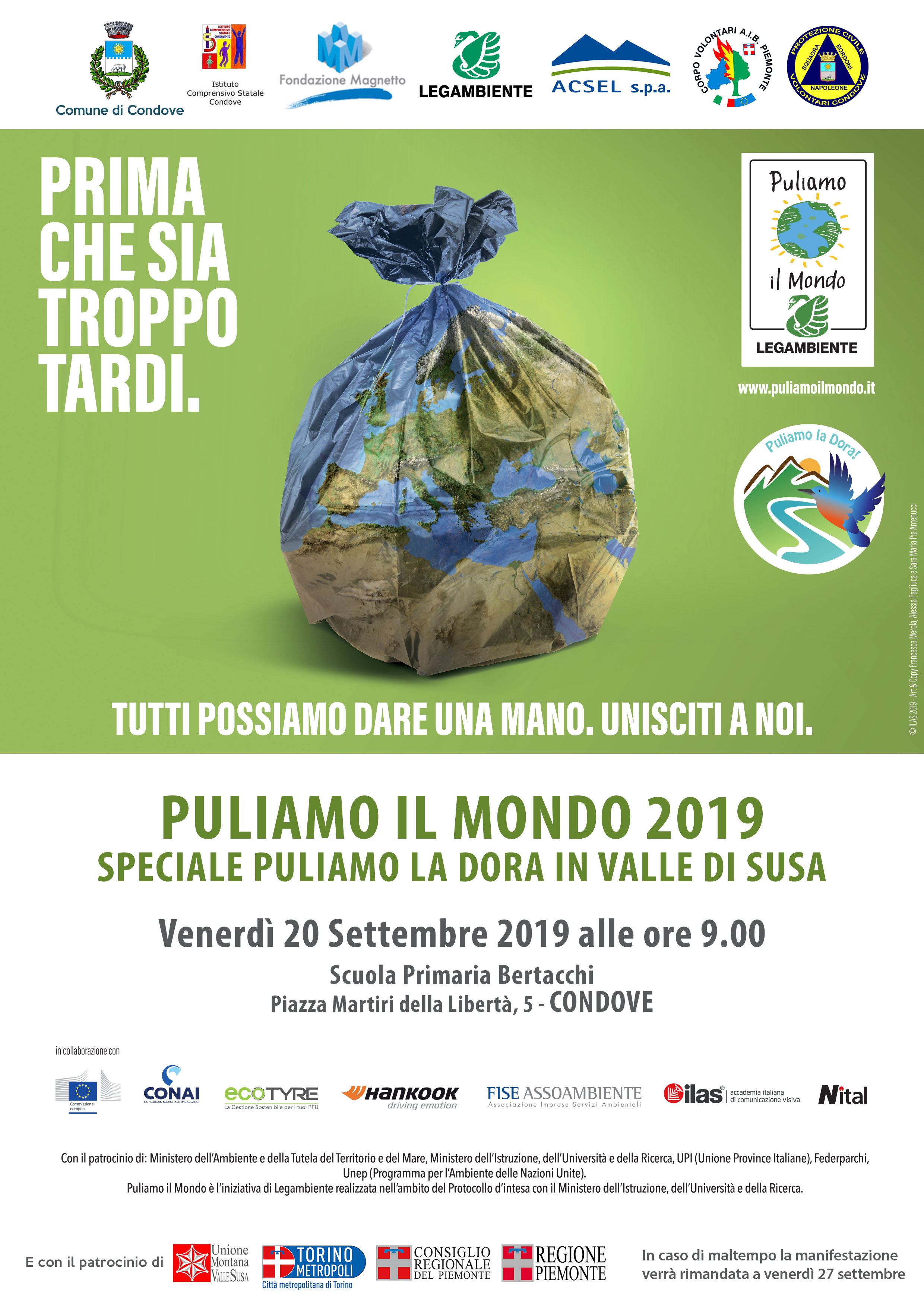 Anche quest'anno Condove aderisce a "Puliamo il mondo", la storica campagna di sensibilizzazione ambientale promossa da Legambiente. Grazie al contributo della Fondazione Magnetto che ha acquistato i kit di pulizia per tutte le scuole della Valle di Susa, anche i bambini della nostra Scuola Primaria "Bertacchi" saranno impegnati a ripulire piazze, strade, parchi ed aree verde del paese assieme ai loro insegnanti, gli amministratori ed alcuni volontari.