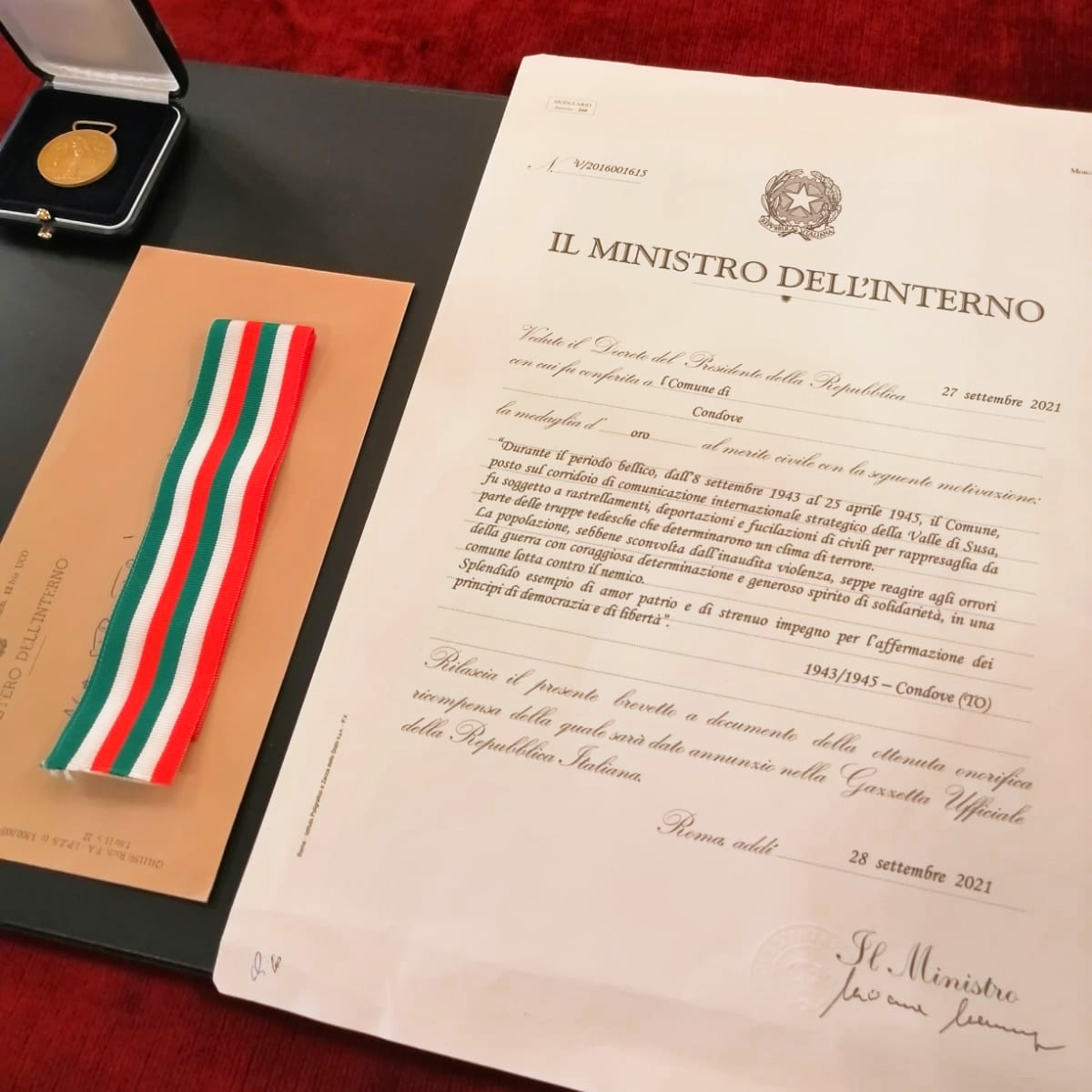 Il Prefetto di Torino, dottor Raffaele Ruberto, ha consegnato al Sindaco dottor Jacopo Suppo la Medaglia d’oro al merito civile conferita al Comune di Condove dal Presidente della Repubblica Sergio Mattarella.