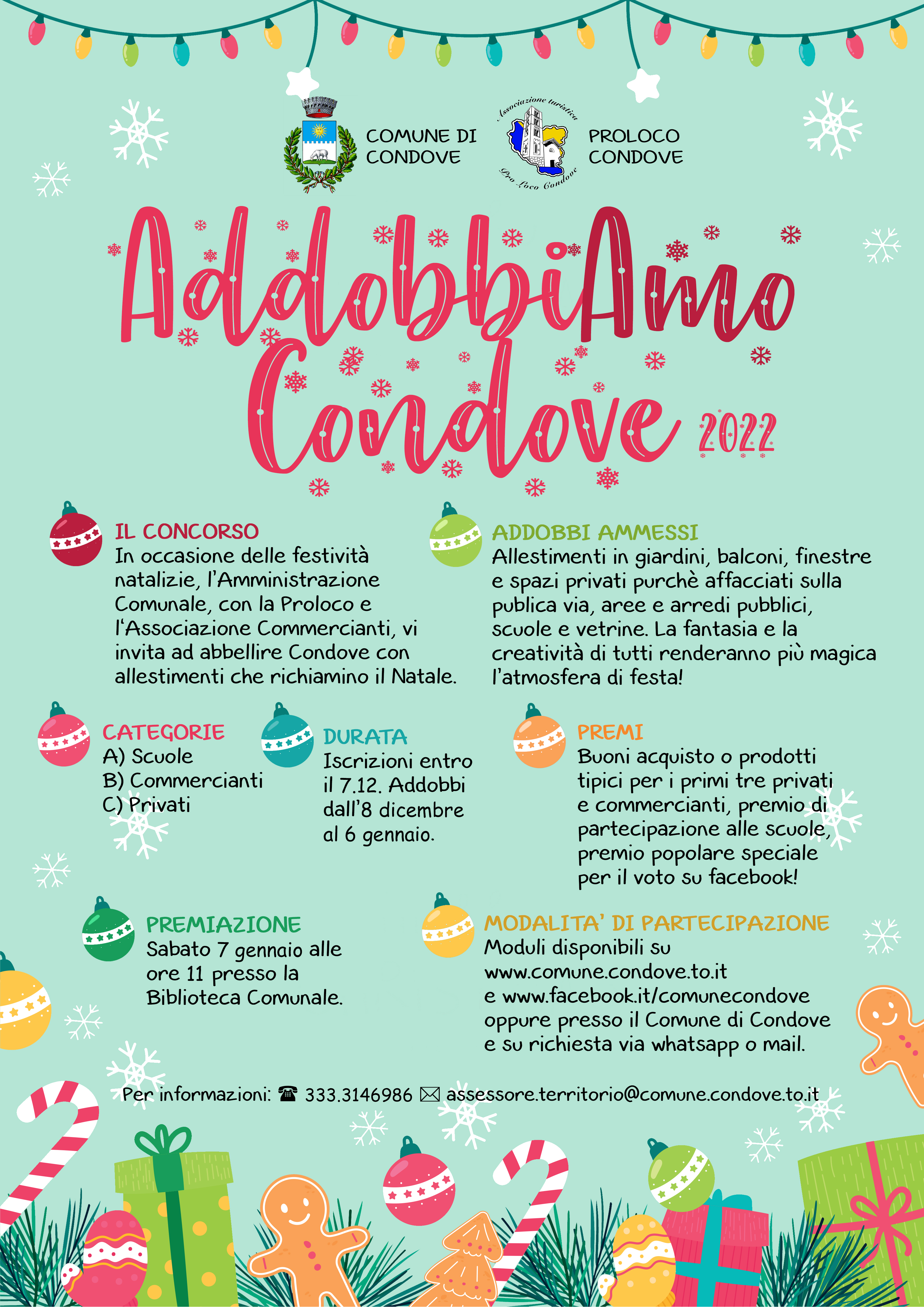 L’Amministrazione Comunale, in collaborazione con l'Associazione Turistica Pro Loco, indice il quarto concorso “AddobbiaAmo Condove”. Il concorso è rivolto a scuole, commercianti e privati affinché abbelliscano angoli privati o pubblici di Condove con allestimenti che richiamino le festività del Natale.