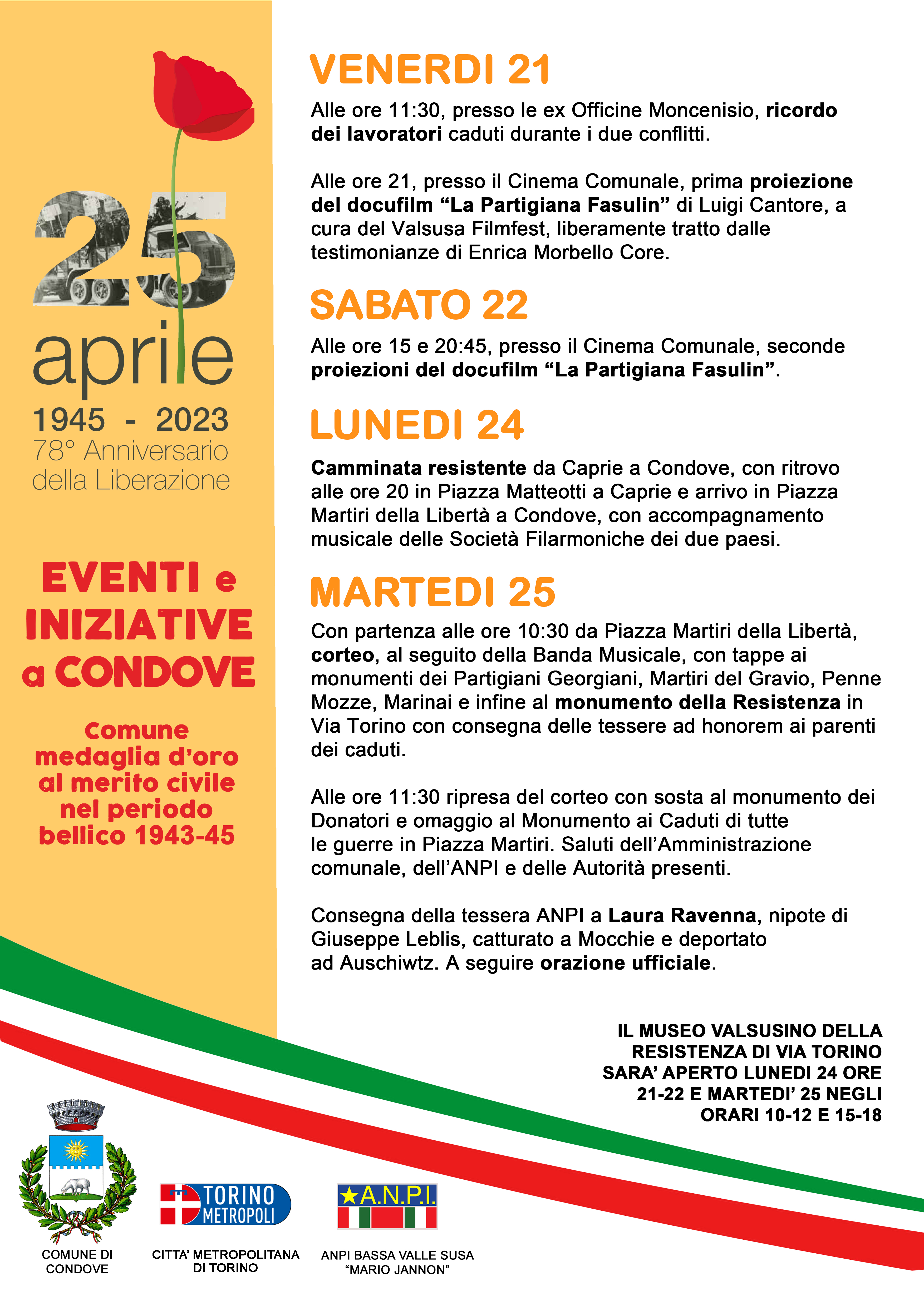 Martedì 25, il consueto corteo percorrerà le vie di Condove e di Caprie con l’omaggio ai monumenti e la conclusione con i discorsi ufficiali, secondo i programmi qui sotto pubblicati.
