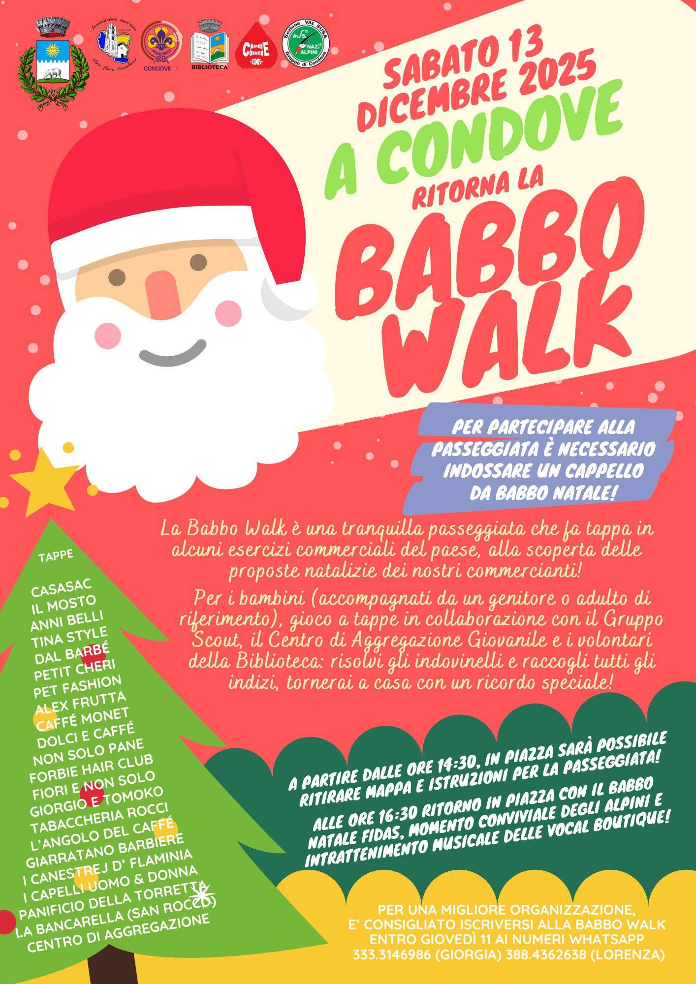 La Babbo Walk inizia alle 14:30 da Piazza Martiri ritirando la mappa della passeggiata con alcune semplici istruzioni. Alle 16:30 si ritornerà in Piazza per un momento di comunità con l'accensione delle luci, bevande calde a cura del Gruppo Alpini Condove, il Babbo Natale Fidas Condove Caprie e l'intrattenimento musicale del gruppo Vocal Boutique!