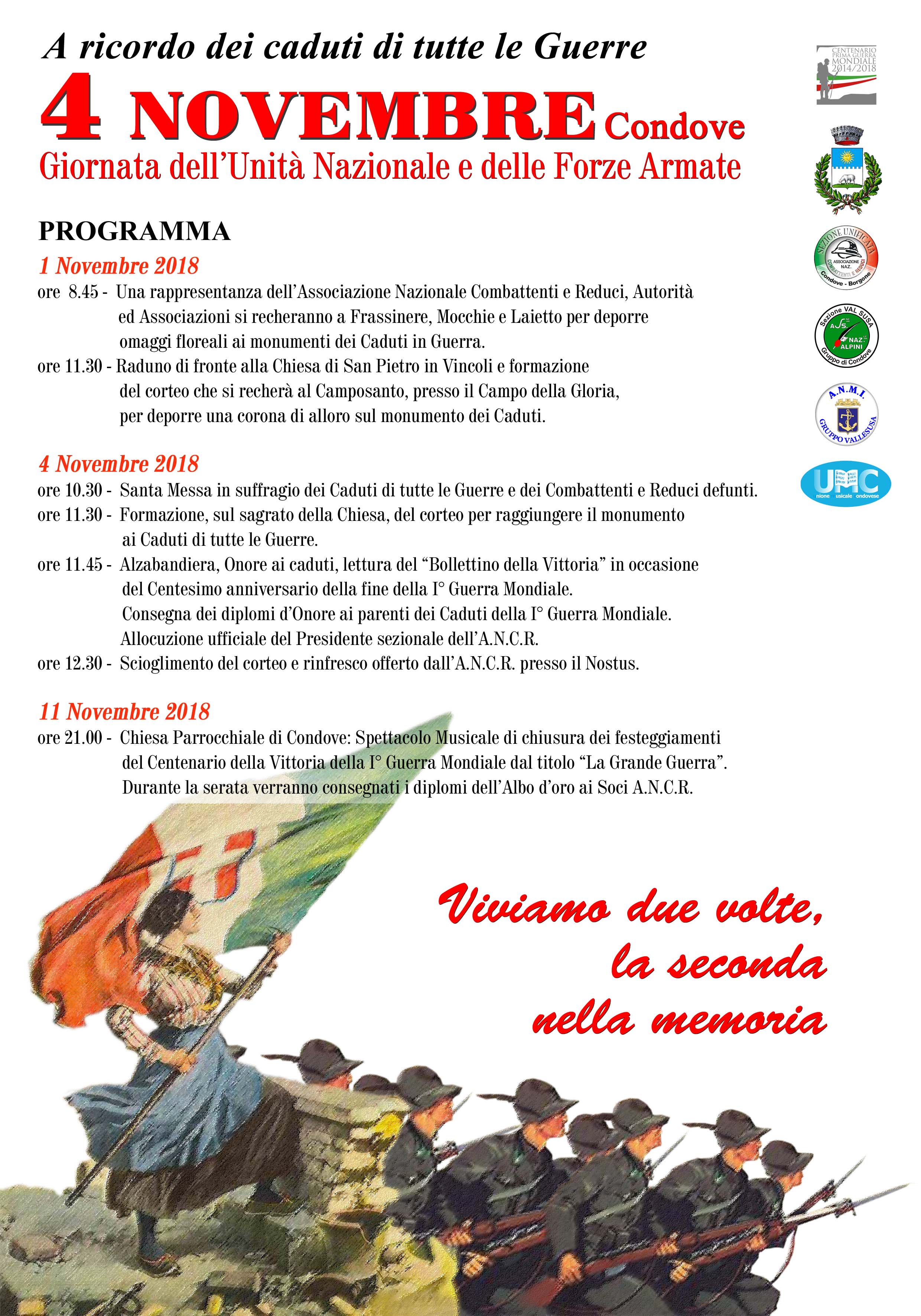 Quest'anno la manifestazione avrà alcuni momenti particolari il giorno 4 Novembre mentre l’11 Novembre il triennio di attività si chiuderà con lo spettacolo musicale organizzato con l’Unione Musicale Condovese cui prenderanno parte il Coro Alpi Cozie Valsusa ed il Gruppo Teatrale Teatroinsieme.