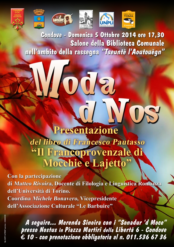 “Moda d nos” è il modo di definire la parlata locale nel francoprovenzale della montagna di Condove: una lingua evolutasi in un vasto territorio, dove anche solo tra una borgata e l’altra possono variare accenti e pronunce, chiave di lettura di un’antica cultura pastorale a rischio di estinzione. Tutto questo è oggi racchiuso in un libro, “Il francoprovenzale di Mocchie e Lajetto”, curato da Francesco Pautasso, un condovese appassionato che ha dedicato diversi anni a ricerche accurate, dando poi alle stampe un testo che è insieme grammatica, vocabolario e approfondimento culturale, grazie anche ai disegni di Giorgio Cinato che illustrano la vita quotidiana dell’ambiente montano. Il lavoro, che verrà presentato domenica 5 ottobre alle 17,30 presso il Salone della Biblioteca, fa parte del calendario della XXV Fiera della Toma ed è un’ iniziativa congiunta di Comune, Chambra d’Oc, Associazione Culturale Le Barbuire e Pro Loco. Coordinata da Michele Bonavero, la presentazione avrà come ospite il prof. Matteo Rivoira, docente di Filologia e linguistica romanza dell’Università di Torino che inquadrerà il caso condovese nell’ambito della ricerca dedicata alle lingue minoritarie del Piemonte. A seguire, per chi lo vorrà, è organizzata una merenda sinoira con i Sonador ‘d Moce presso “Nostus”, piazza Martiri della Libertà 6. Costo 10 €, prenotazione obbligatoria al 011 53.66.736