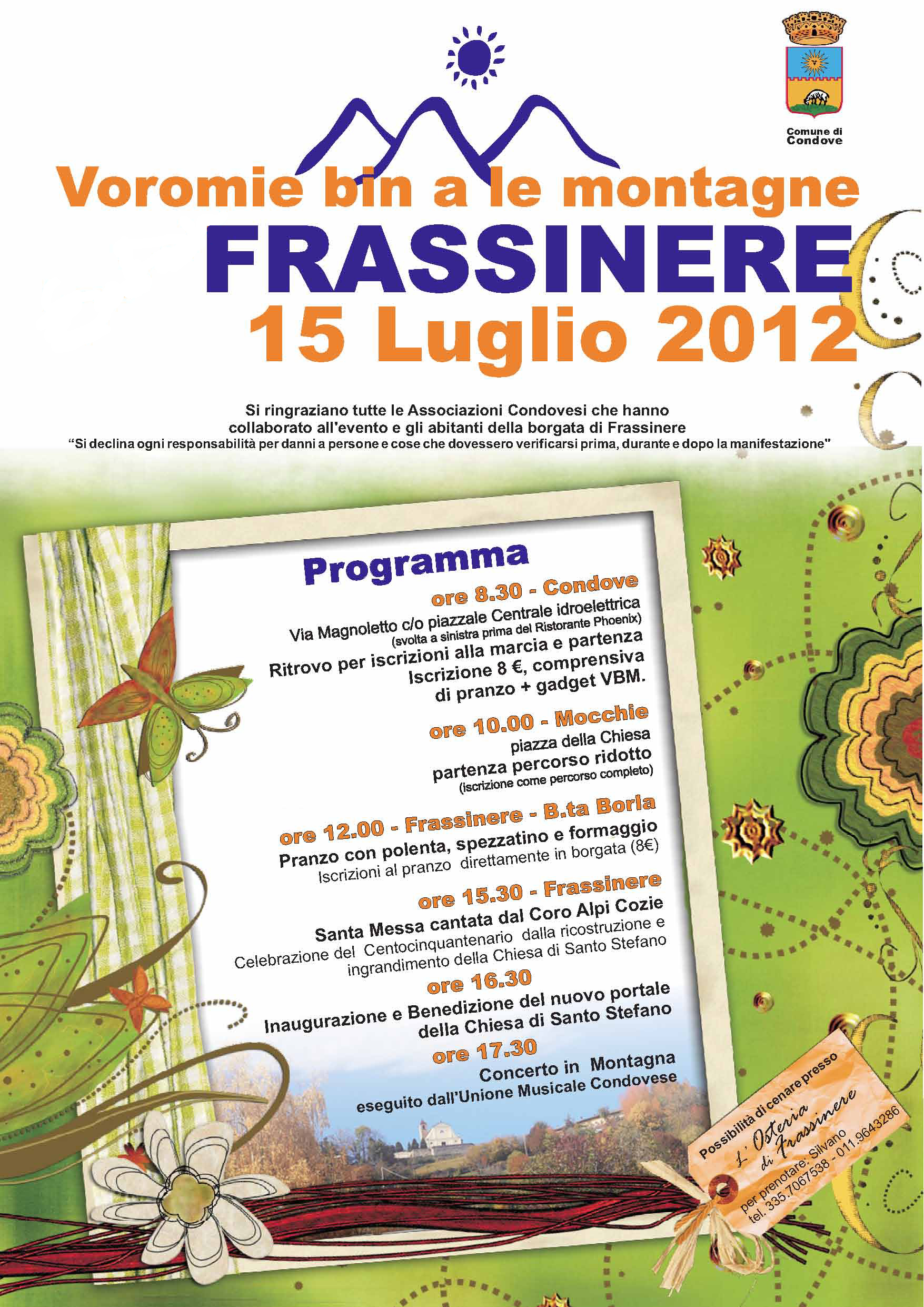 Quest'anno il comune di Condove organizza la festa nella Borgata di Frassinere per la celebrazione del Centocinquantenario dalla ricostruzione e ingrandimento della Chiesa di Santo Stefano. La marcia parte alle ore 8.30 da Condove e alle 10.00 da Mocchie (Iscrizione 8 €, comprensiva di pranzo + gadget VBM)