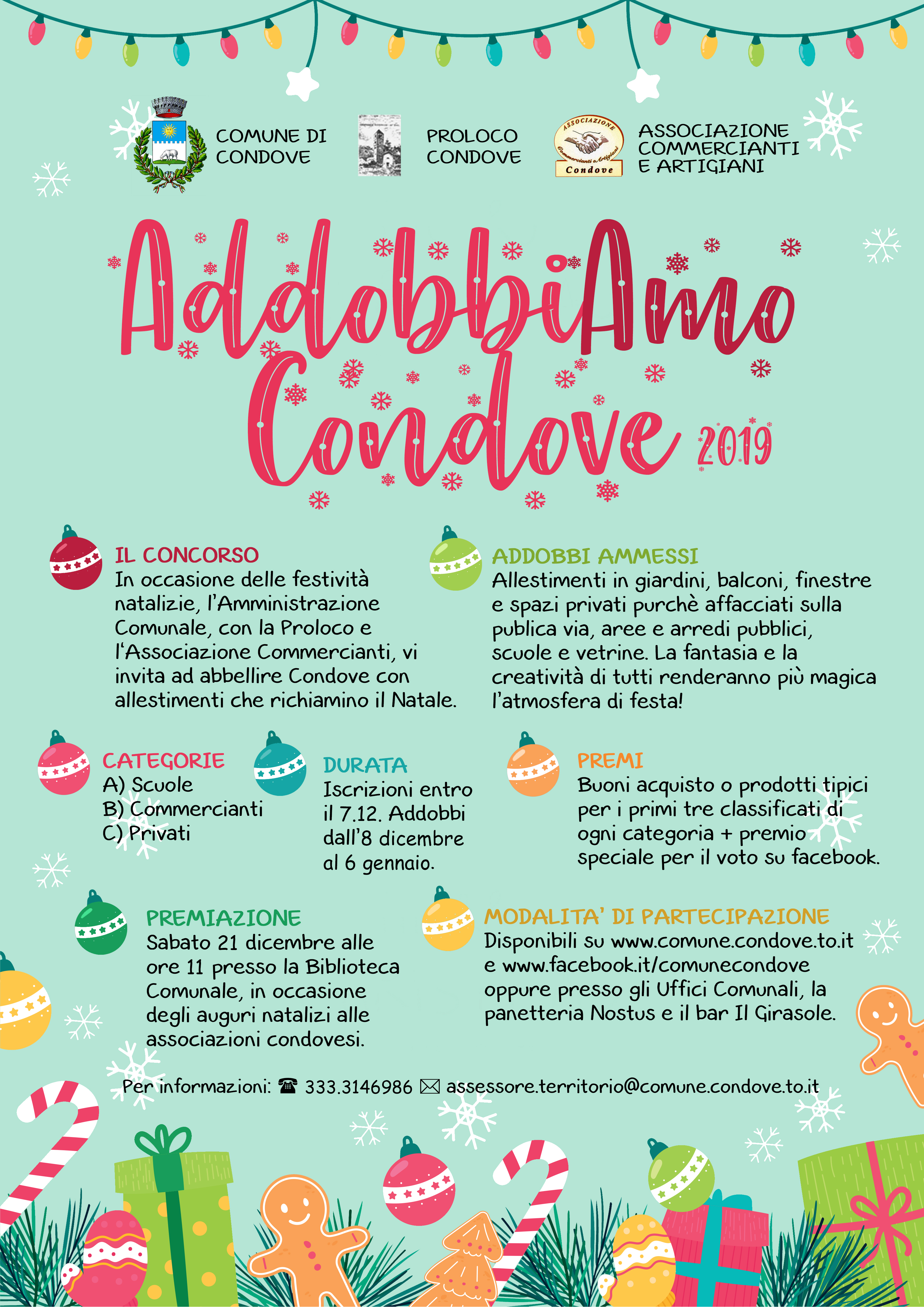 L’Amministrazione Comunale, in collaborazione con l'Associazione Turistica Pro Loco e l'Associazione Commercianti e Artigiani, indice la prima edizione del concorso “AddobbiaAmo Condove”. Il concorso è rivolto a scuole, commercianti e privati affinché abbelliscano angoli privati o pubblici di Condove con allestimenti che richiamino le festività del Natale, per vivere insieme una maggiore atmosfera di festa.