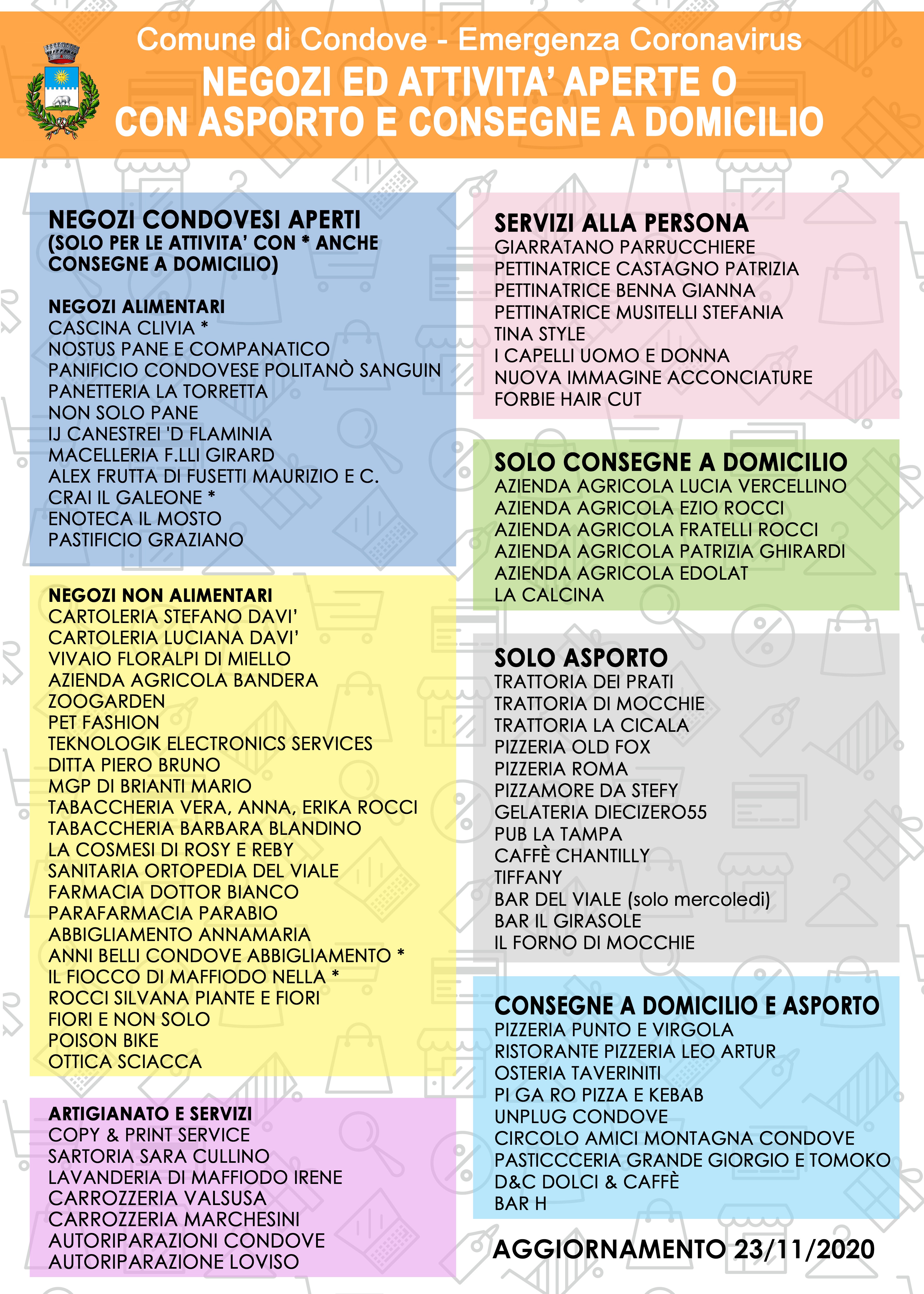 A seguire il manifesto con tutt gli esercizi commerciali che si sono organizzati per garantire l'apertura, l'asporto o la consegna a domicilio.