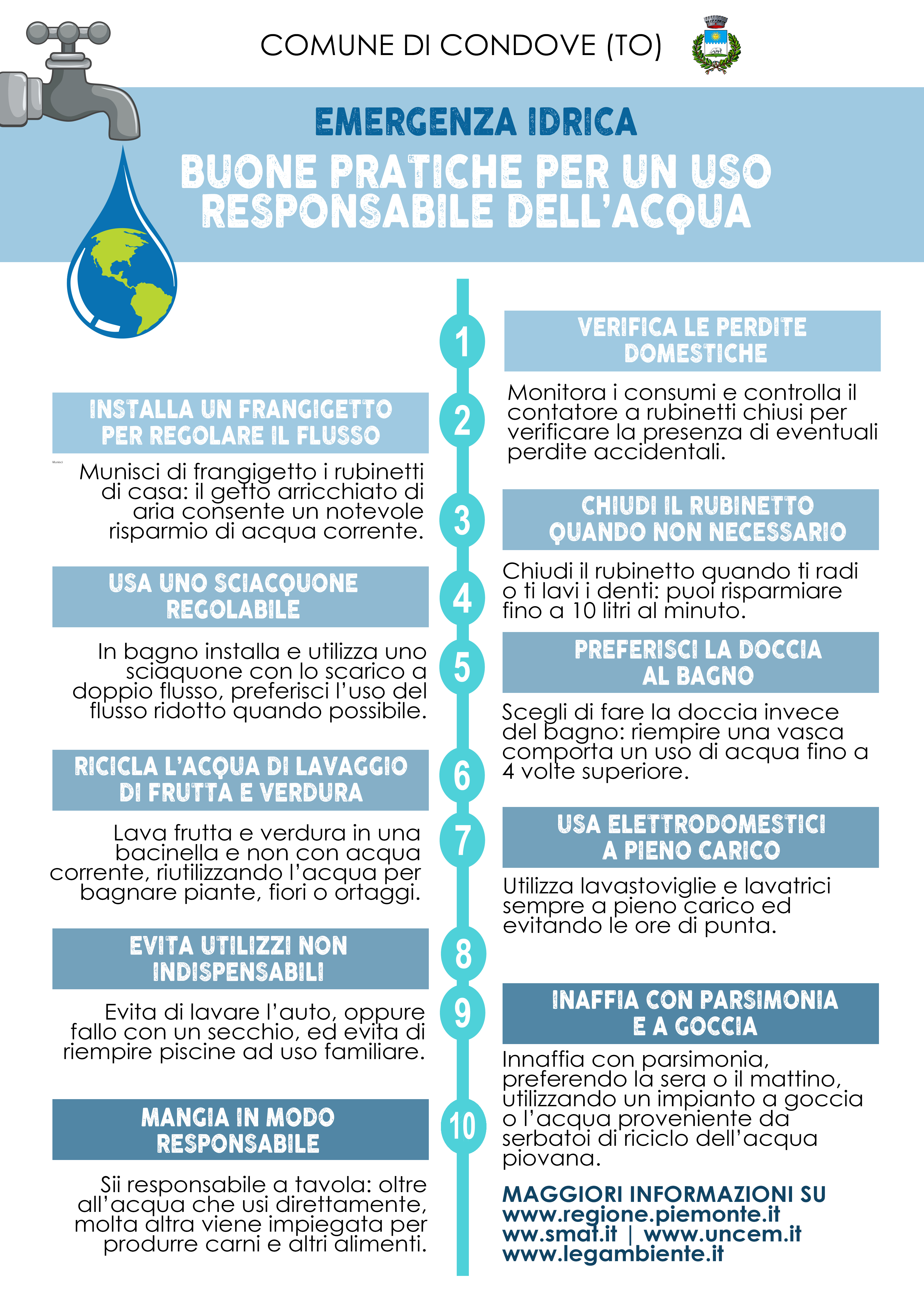 Il comune di Condove rientra attualmente al livello 2, e per questo motivo si è reso necessario emettere l’ordinanza che vieta a tutta la Cittadinanza, su tutto il territorio comunale, con decorrenza immediata e sino al termine della criticità idrica che sarà comunicata con revoca della presente ordinanza, il divieto di prelievo e di consumo di acqua potabile per