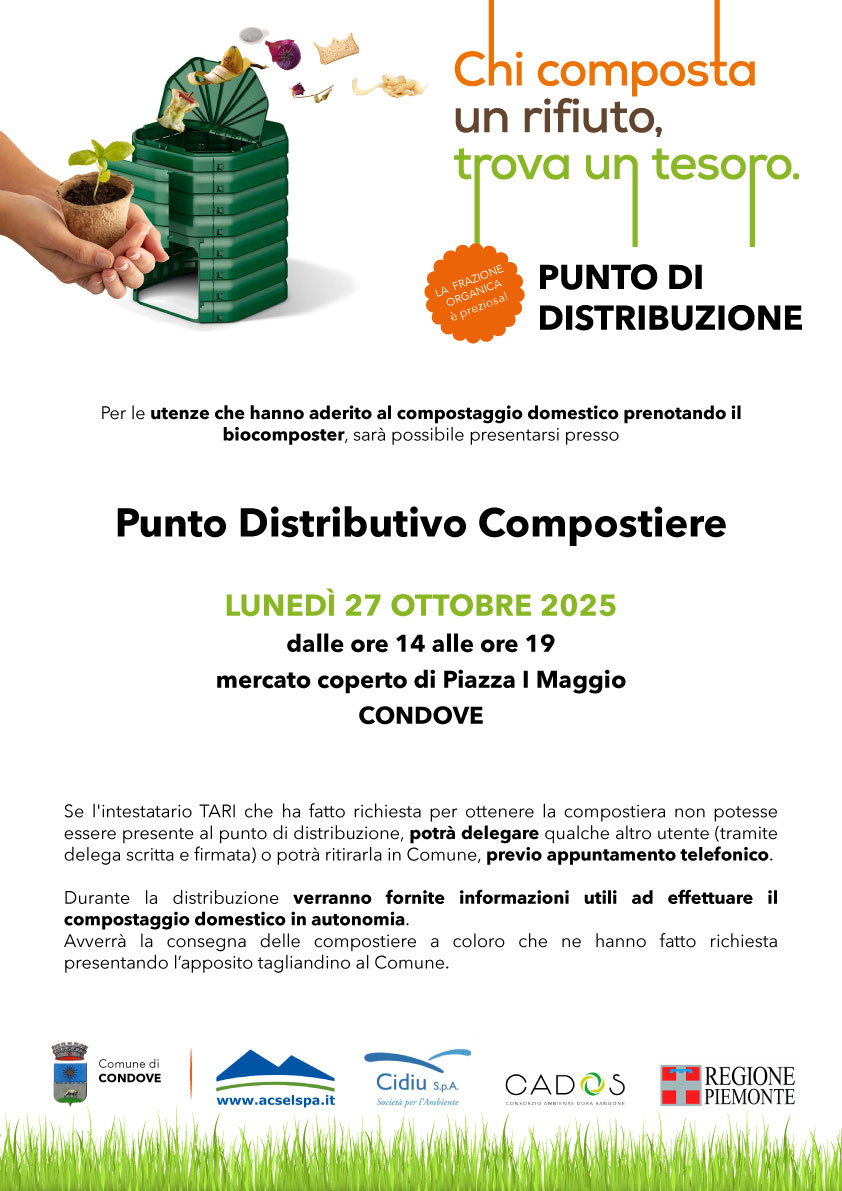 Il giorno 27/10/2025 dalle 14,00 alle 19,00 presso il Mercato coperto di Piazza I Maggio ci sarà il punto di consegna del/i biocomposter ordinato/i