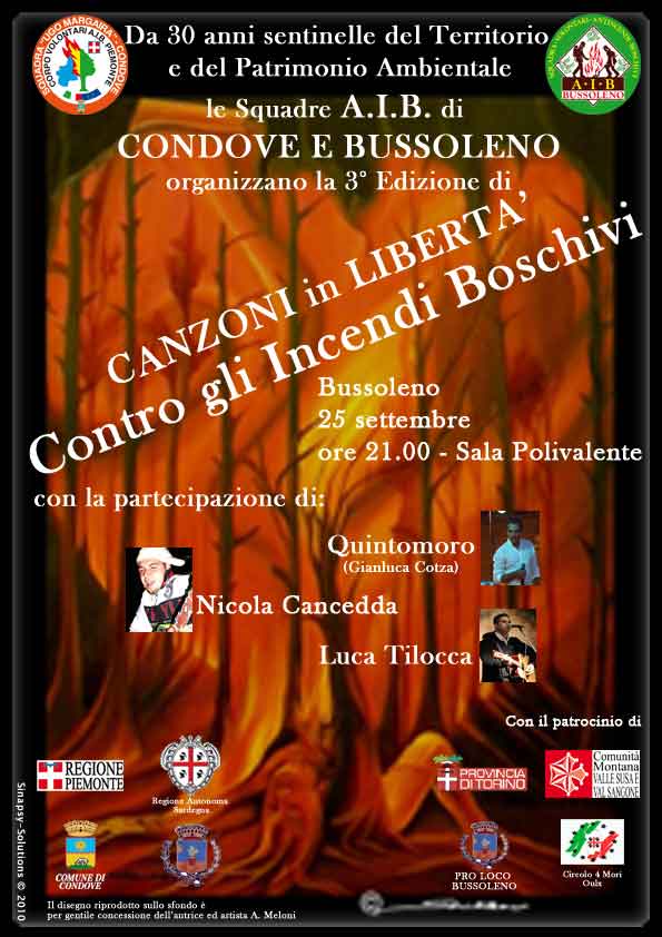 Le squadre A.I.B. di Condove e Bussoleno, da 30 anni sentinelle del territorio e del patrimonio Ambientale, organizzano la 3° edizione di "Canzoni in Libertà", contro gli incendi boschivi, con la partecipazione di Quintomoro (Gianluca Cotza), Nicola Cancedda e Luca Tilocca.