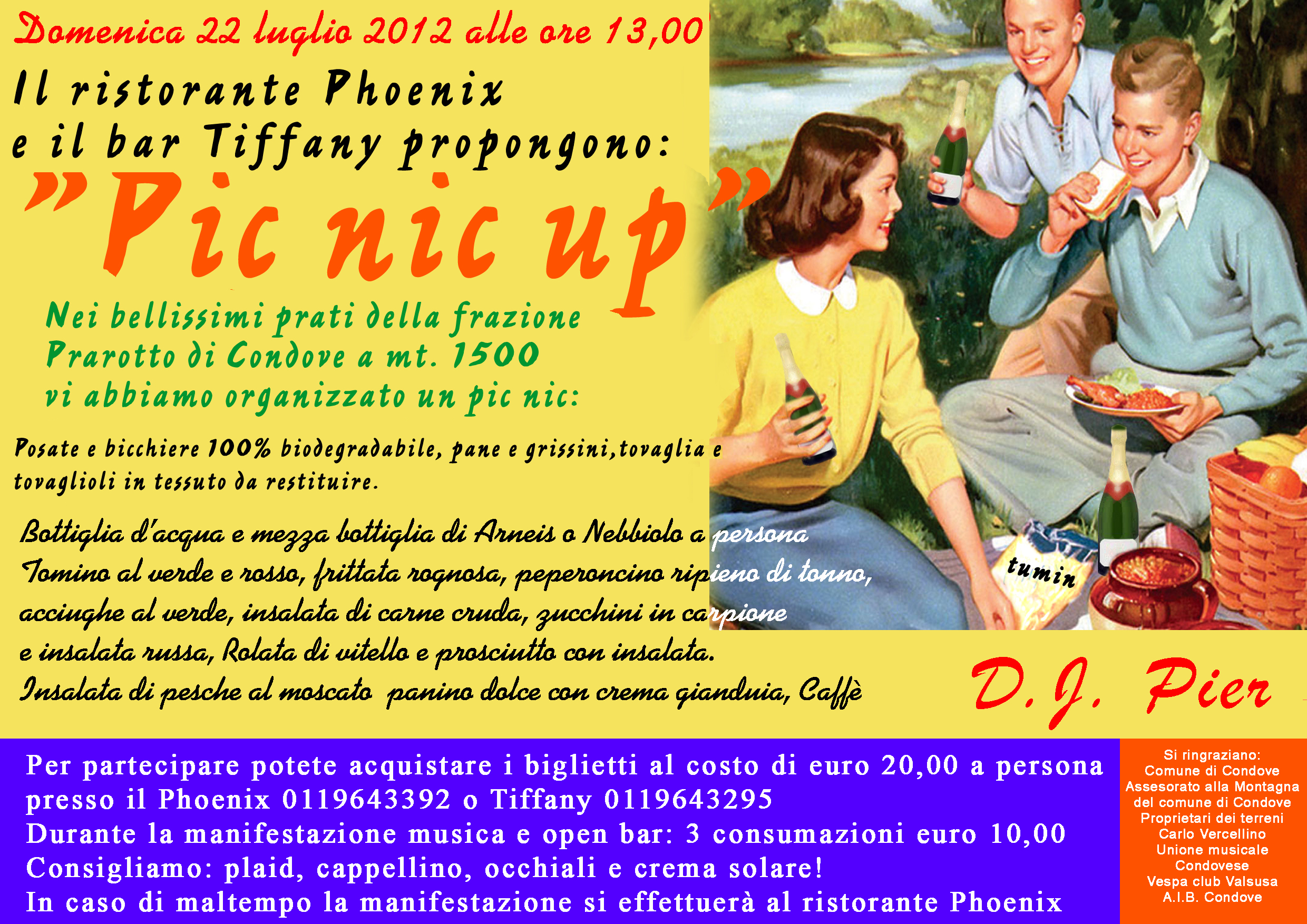 Il Ristorante Phoenix e il Bar Tiffany vi aspettano domenica 22 Luglio alle ore 13.00 per un bellissimo picnic sui prati di Prarotto, menu e info sul sito www.comune.condove.to.it