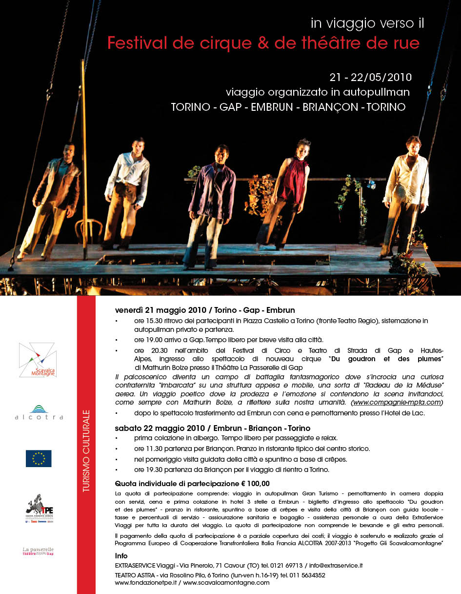 Venerdì 21( dalle ore 1530) a sabato 22 maggio, nell'ambito del Programma Europeo di Cooperazione Transfrontaliera italo-francese ALCOTRA 2007 - 2013 " Progetto Gli Scavalcamontagne", sviluppato dalla Fondazione TPE di Torino e dal Théatre la Passerelle di Gap, proponiamo un viaggio organizzato da Torino a Gap per assistere ad uno spettacolo in programma al Festival de cirque & de théatre de rue, con la possibilità di visitare la città di Gap, di Embrun e di Briancon.